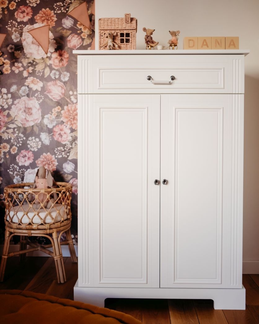 Comoda din colecția Ines este menținută într-un stil clasic, plin de eleganță combinată cu funcționalitate maximă. Este perfectă pentru camera unui copil, dormitorul părinților sau un hol. Este încăpătoare și spațioasă, cu mult loc pentru multe lucruri. Principalele beneficii: - 4 rafturi, 3 reglabile - sertar spațios - mânere lucrate manual, foarte confortabile de utilizat - poate fi montat pe perete (recomandat) - respectă standardele și normele europene de siguranță Dimensiuni (cm): Lățime: 83,8 cm înălțime: 125 cm adâncime: 43,6 cm Design și finisaje ale mobilierului: - fronturile sertarelor, lateralele, blatul și bazele sunt din MDF lăcuit în alb elegant sau gri neutru - rafturile interioare sunt din placă laminată de înaltă calitate, vopsită în alb - ghidaje Blum de calitate superioară, cu sistem de închidere și încetinire - mânere din porțelan lucrate manual - vopselele folosite în procesul de vopsire sunt sigure pentru copii, certificate și nu provoacă alergii Culori: - alb elegant - gri neutru Instrucțiuni: Biblioteca trebuie curățată cu o lavetă moale din bumbac, umezită cu apă sau cu un produs de îngrijire a mobilei. Informații suplimentare: Mobila este livrată în colete pentru auto-asamblare. Instrucțiuni detaliate de asamblare sunt furnizate în colete împreună cu echipamentul (șuruburi etc.).