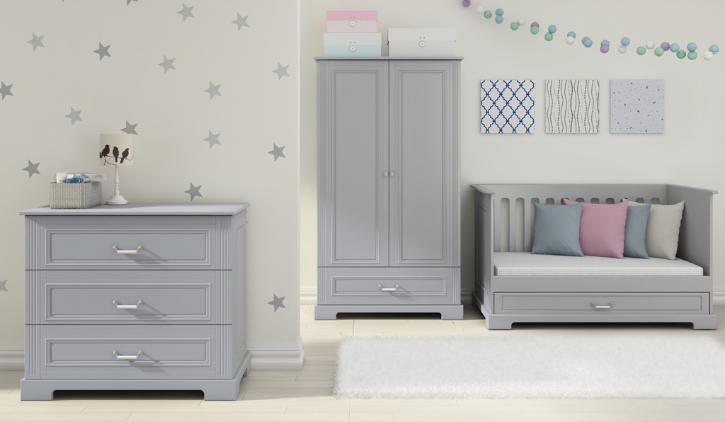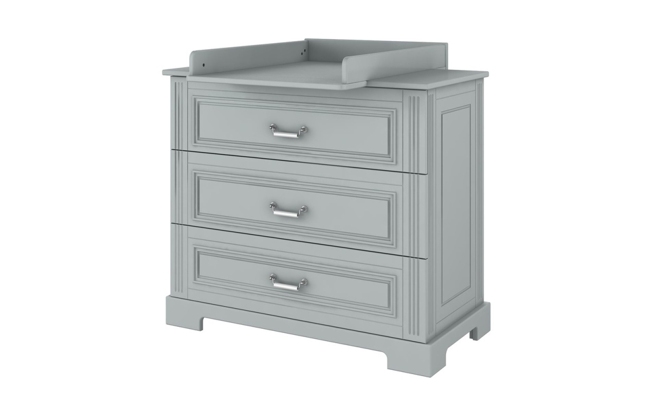 Comoda Ines încăpătoare cu 3 sertare este potrivită pentru o mulțime de haine sau produse de îngrijire. Comoda a fost adaptată pentru instalarea unei mese de înfășat (în mijlocul comodei). Vă puteți purta bebelușul cu toate accesoriile la îndemână. Principalele avantaje: - trei sertare încăpătoare, - se poate instala un schimbător deasupra, - se poate monta pe perete – recomandat, - mânere confortabile, lucrate manual, - respectă standardele și normele de siguranță europene. Dimensiuni (cm): înălțime: 90 adâncime: 51 lățime: 102 Materiale și finisaje pentru mobilier: - fronturile sertarelor, lateralele, blatul și soclul sunt fabricate din MDF lăcuit, de culoare alb elegant sau gri neutru - corpul este fabricat din placă laminată de înaltă calitate, rezistentă la deteriorări și umiditate, ușor de curățat - șine de ghidare silențioase cu funcție de auto-închidere de la Blum - mânere din porțelan lucrate manual - vopselele utilizate în procesul de lăcuire sunt sigure pentru copii, aprobate EN71/3 și nu provoacă alergii. Culori: - alb elegant - gri neutru. Manual de utilizare: Mobila trebuie ștersă cu o lavetă moale, din bumbac, umezită cu apă sau cu un produs destinat îngrijirii mobilei. Informații suplimentare: Mobila este livrată în colete, destinate asamblării individuale. Pachetele includ instrucțiuni detaliate de asamblare, împreună cu accesorii (șuruburi etc.).