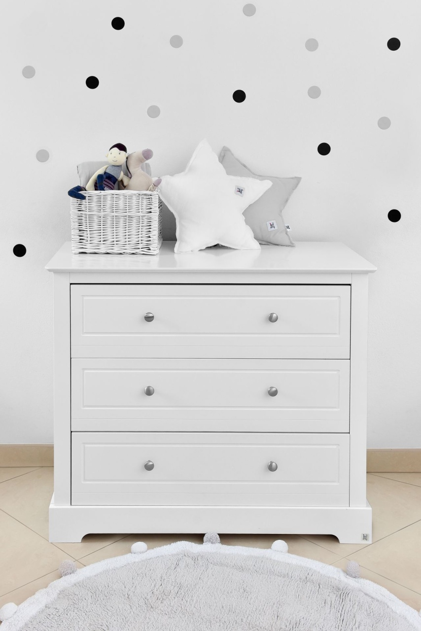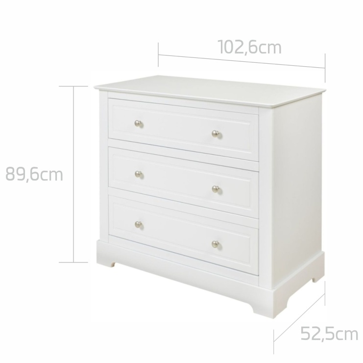 Comoda Marylou este fabricată din MDF de înaltă calitate, vopsită în alb, sigură pentru copii, și din tablă de mobilier (laterale și părți interne). Pentru a spori siguranța și confortul în utilizare, s-au folosit șine de ghidare sigure și fiabile, echipate cu un sistem suplimentar de închidere. - 3 sertare încăpătoare - șine de ghidare silențioase cu funcție de auto-închidere de la Haffele - se poate instala un schimbător deasupra Dimensiuni: (cm): Lățime: 102,6, A: 52,5, Î: 90 Mobilierul este finisat cu o vopsea special selectată de la un furnizor italian, care are caracteristici unice de întărire, astfel încât mobilierul este rezistent la două tipuri de daune: - Substanțe chimice: protejează împotriva efectelor apei, loțiunilor, uleiurilor și altor detergenți; - Protecție mecanică împotriva tuturor tipurilor de zgârieturi rezultate în urma utilizării mobilierului. Vopseaua asortată creează o structură de acoperire perfect netedă. Materialele speciale creează efectul de matizare a satinului delicat. Vopseaua are toate certificatele necesare. În plus, înainte de punerea în vânzare, mobilierul vopsit este testat în laboratoare din punct de vedere al emisiilor. Toate produsele noastre sunt ambalate în ambalaje plate și pot fi asamblate individual, cu instrucțiuni ușor de urmat incluse pentru confortul dumneavoastră.