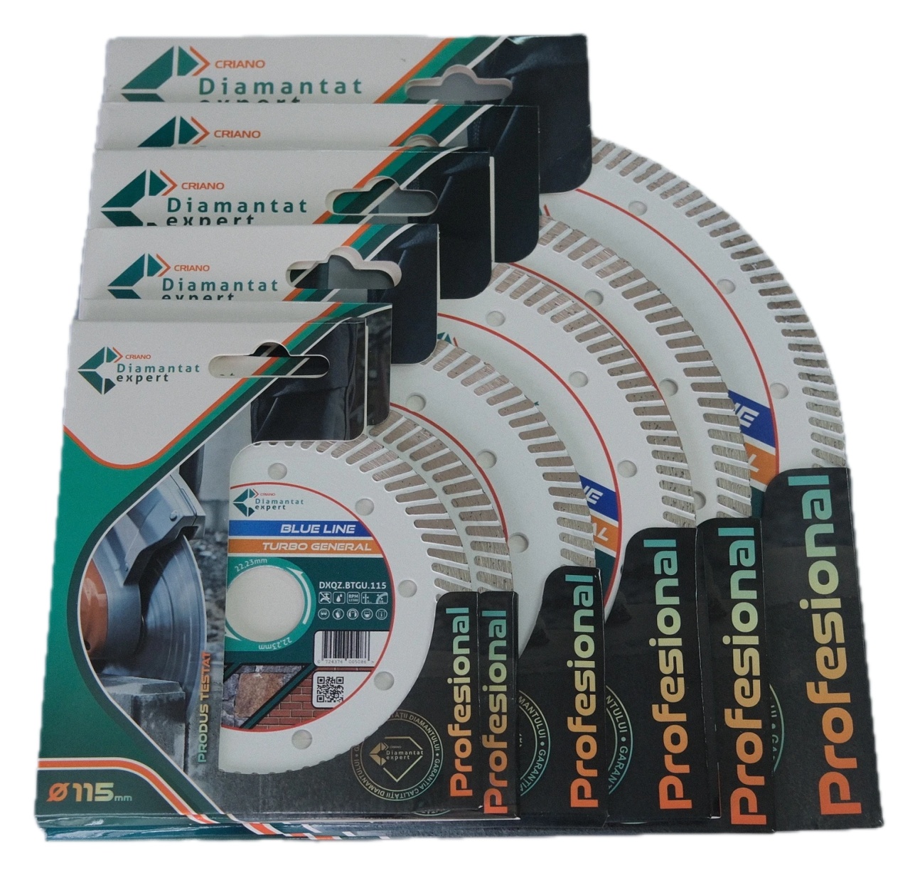 Disc DiamantatExpert TURBO pt. Beton Ranforsat Usor, Materiale de constructii 115x22.23 (mm) taiere uscata sau umeda, Blue Line Profesional - DXQZ.BTGU.115 Calitate : Blue Line Profesional - calitate profesională de bună performanță DIY Pentru : beton armat ușor, beton, plăci subțiri din piatră naturală, cărămizi Tăiere : uscată sau cu apă Utilizare cu : polizor unghiular (13,300rpm max) Descriere Proiectat pentru tăieri generale , acest disc combină acțiunea agresivă de tăiere turbo cu finisajul neted al lamei continue. Găurile din apropierea marginii discului permit răcirea eficientă în aplicații fără răcire cu apă (DRY) . Utilizare generală versatilă – Beton, cărămizi dure, piatră naturală – un singur disc pentru mai multe aplicații. Segment presat la cald / sinterizat – Durabilitate mare pentru utilizări semi-profesionale. Segment Hibrid Turbo-Continu - Viteză crescută de tăiere combinată cu un finisaj fin – ideal pentru versatilitate. Durată mare de viață – Segment de 10 mm pentru performanță extinsă la tăiere și economie pe termen lung. Blue Line Profesional – Randament bun la preț accesibil – alegerea perfectă pentru șantiere mici sau bricolaj avansat. Durata de viață: Bună 3/6 Viteza de tăiere: Bună 3/6 Diametru disc ext. x int.: 115 x 22,23mm Inaltime segment: 10,0mm. Grosime segment: 2,0mm.