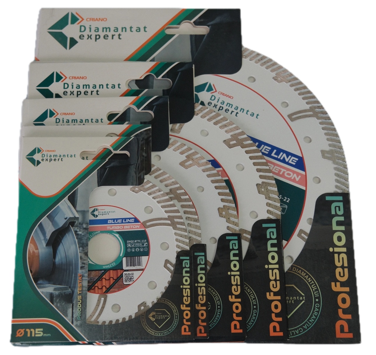 Disc DiamantatExpert TURBO Segmentat pt. Beton Ranforsat Usor, Materiale de constructii 115x22.23 (mm) taiere uscata sau umeda, Blue Line Profesional - DXQZ.BTTC.115 Calitate : Blue Line Profesional - calitate profesională de bună performanță DIY Pentru : beton armat ușor spre mediu, beton, plăci subțiri din piatră naturală, cărămizi, țigle Tăiere : uscată sau cu apă Utilizare cu : polizor unghiular (13,300rpm max) Descriere Proiectat pentru tăieri rapide și precise în beton mediu armat , cărămizi dure , țiglă ceramică și piatră naturală subțire . Ideal pentru lucrări de construcții generale unde viteza și durabilitatea contează. Tăiere agresivă, rezultat curat - Tăiere rapidă și eficientă chiar și în cele mai dure materiale. Dinții turbo intră rapid în material, dar lasă o linie curată și precisă. Utilizare generală versatilă – Pentru mai multe tipuri de materiale, performanță solidă pe beton armat, cărămidă, piatră și țiglă. Perfect pentru tăiere uscată - Rezistență excelentă la supraincalzire datorită structurii robuste a segmentului. Segment presat la cald / sinterizat – Durabilitate mare pentru utilizări semi-profesionale. Durată mare de viață – Segment de 10 mm pentru performanță extinsă la tăiere și economie pe termen lung. Blue Line Profesional – Randament bun la preț accesibil – d iscul ideal pentru șantiere variate și aplicații zilnice. Durata de viață: Bună 3/6 Viteza de tăiere: Bună 3/6 Diametru disc ext. x int.: 115 x 22,23mm Inaltime segment: 10,0mm. Grosime segment: 2,2mm.