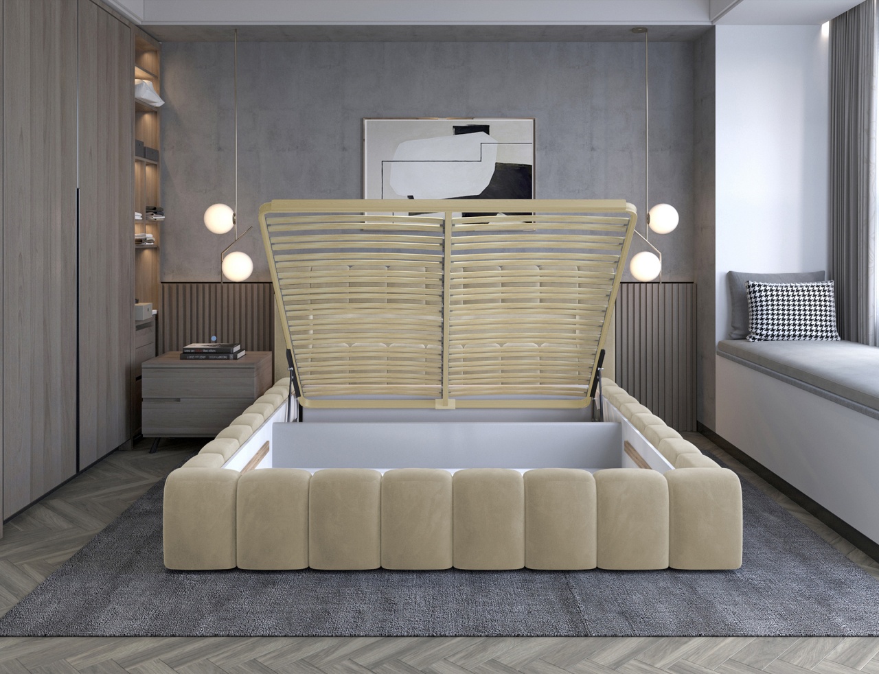 Lamica este un pat în stil glamour foarte confortabil, moale și original, care impresionează prin forma sa. Patul Lamica se distinge prin design, deoarece tetiera înaltă și părțile laterale ale patului sunt create cu spumă suplimentară. Dimensiuni: Lățime: 162 cm Adâncime: 232 cm Înălțime: 90 cm Înălțime șezut: 30 cm Alegerea suprafeței de dormit: 140x200 cm Cu somieră de lemn Produsul nu este montat, montarea este rapidă și ușoară. Produsul este personalizabil, culoarea și materialul se aleg pe baza paletarelor la cererea clientului. Prețul poate suferi modificări în funcție de grupa de material aleasă.