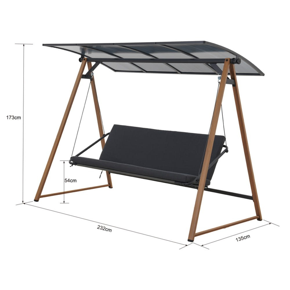 Balansoarul este perfect pentru a crea un spațiu confortabil de relaxare în aer liber, iar designul său simplu și modern îl face potrivit pentru diverse stiluri de decor în grădină sau pe terasă. Elegant și rafinat, această piesă de mobilier va înfrumuseța spațiul în care va fi amplasat. Dimensiuni balansoar: Lungime: 232 cm Lățime: 135 cm Înălțime totală: 173 cm Înălțime de la sol la șezut: 54 cm Detalii tehnice: - oțel acoperit cu pulbere - materialul este rezistent la coroziune și condițiile meteorologice, astfel produsul va dura mai mult - copertină - material policarbonat - perna de șezut este fabricată din poliester, care are o absorbție redusă de apă și este ușor de întreținut Culoare: - antracit Produsul nu este montat, acesta necesită asamblare. Instrucțiunile de montaj vin în colet.