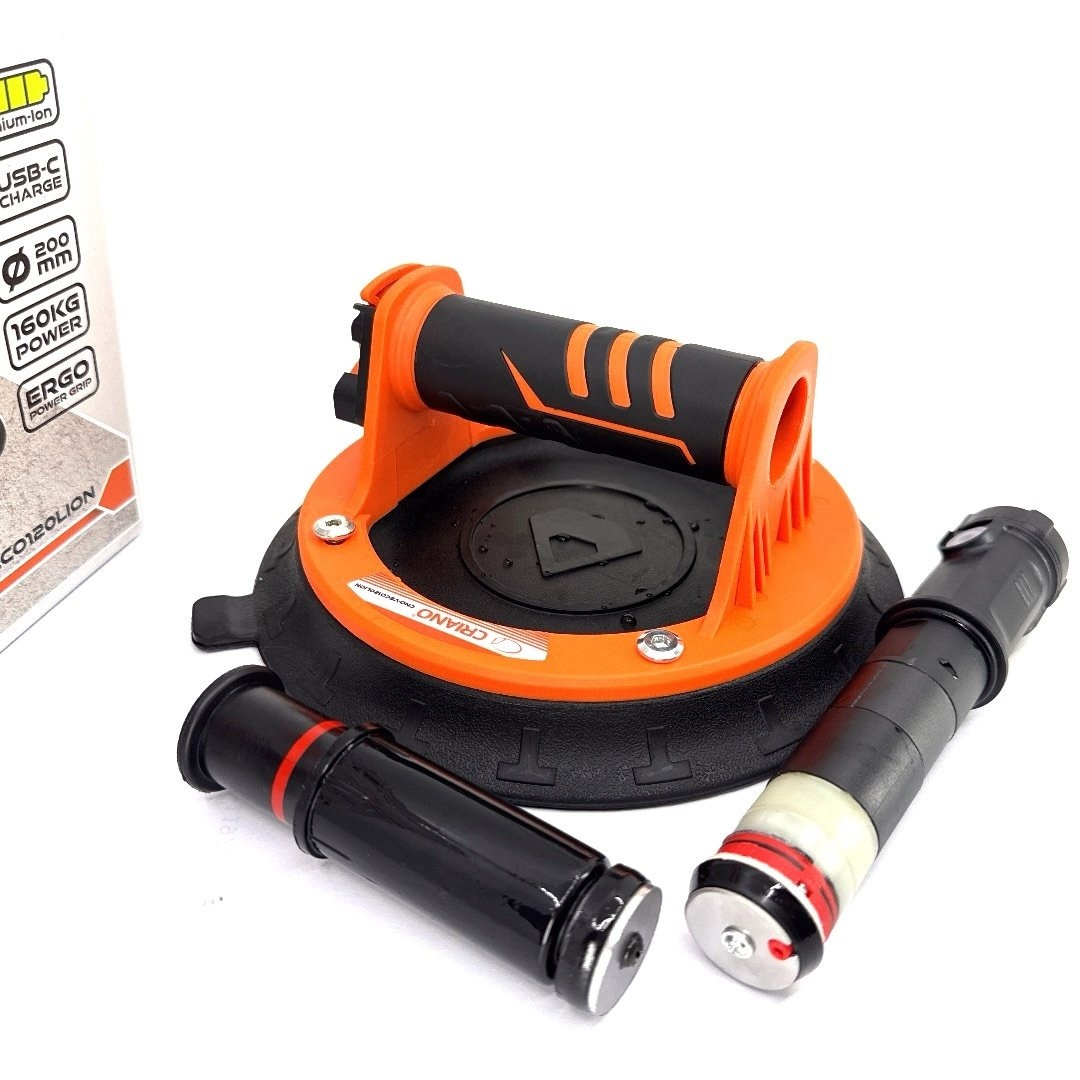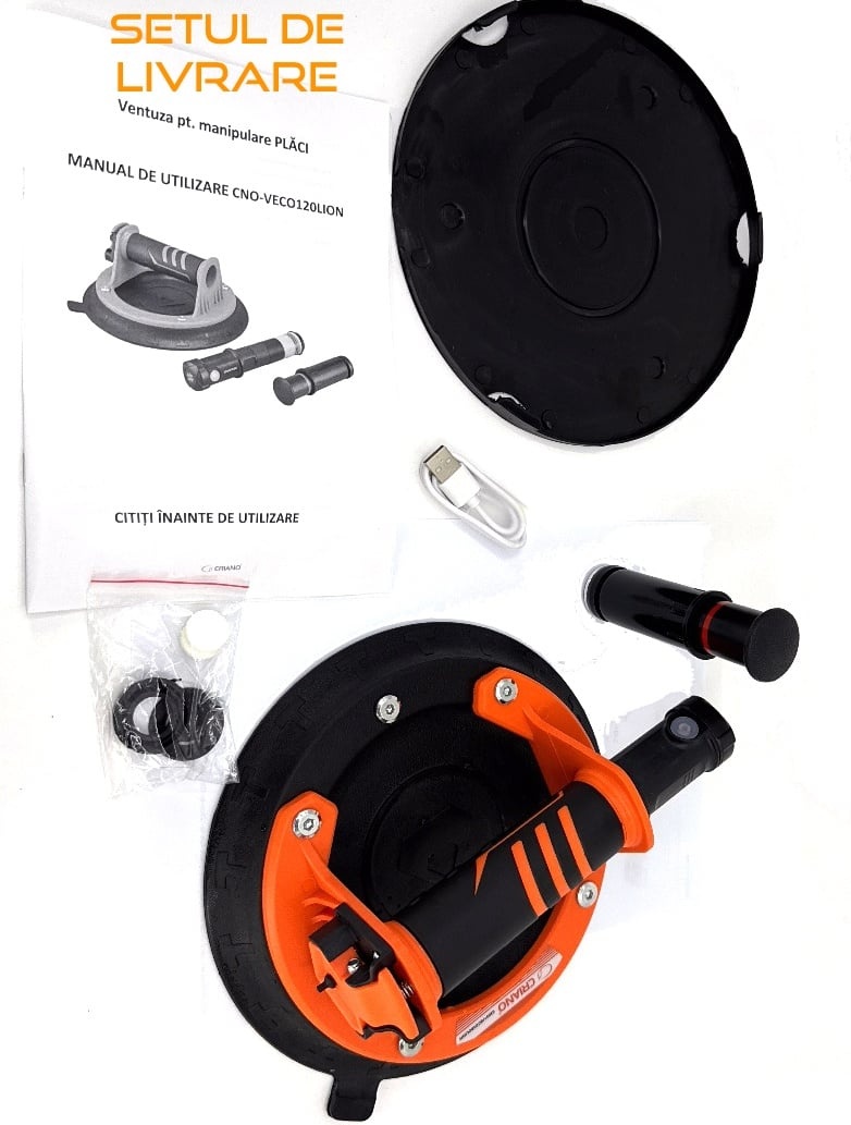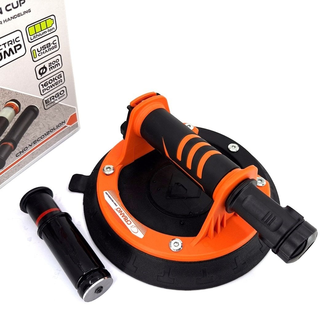Ventuza Profesionala cu pompa ELECTRICA de vid pentru manipulare placi rugoase sau fine Ø200mm, 150kg - CNO-VECO120LION din gama de ventuze gresie SE LIVREAZĂ CU 2 POMPE (una electrică reîncărcabilă USB-C și una manuală) Capacitate maximă de prindere: 160 kilograme Capacitate maxima recomandata de prindere: 120 kilograme Diametrul ventuzei: 200 mm Putere pompă: 3.7V, 2000mA Poate fi utilizata pentru suprafete lucioase sau rugoase (texturate). Excelenta pentru ridicare sau transport de materiale precum: gresie, faianta, sticla, plastic, metal, piatra, etc. Maner din material foarte aderent pentru un control foarte bun al ventuzei. Include un inel rosu pe butonul pompei care semnalizeaza scaderea vidului, oferind siguranta sporita. Ventuza se adapteaza la o varietate mare de texturi ale placilor. (gresie sau faianta cu denivelari sau suprafete rugoase, lemn laminat texturat, etc.) Generarea vacumului se face usor si rapid prin actionarea electrica a pompei. Mecanism de eliberare rapida a presiunii. Se livreaza in cutie de carton.